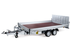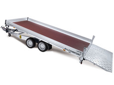 Der ALLCOMFORT Universaltranporter von Humbaur mit hydraulisch kippbarer Brücke für multifunktionale Einsatzmöglichkeiten. Das Kipplager bildet eine feste Verbindung zwischen Brücke und den beiden Achskörpern und sorgt so für optimale Lastaufnahme und ruhiges Fahrverhalten. Seine sehr niedrige Ladehöhe von 650 mm. Beladen wird der ALLCOMFORT mittels einer kippbaren Brücke, die sich hydraulisch über eine Handpumpe und einem doppeltwirkenden Zylinder verstellen lässt. Über die 900 mm hohe Überfahrwand mit Speziallochprägung, die an einem äußerst massiven Unterfahrschutz befestigt ist, können sie ihre Fahrzeuge direkt und sicher auf den ALLCOMFORT verladen. Für eine noch leichtere Bedienung ist an der Überfahrwand jetzt eine Gasfederunterstützung serienmäßig angebracht. Durch die Kombination der kippbaren Brücke mit der Überfahrwand erreichen man einen hervorragenden Auffahrwinkel, der es ihnen erlaubt auch tieferliegende Maschinen und Automobile problemlos zu verladen. Auf dem ALLCOMFORT steht das Transportgut auf einem Boden aus mehrfach wasserfest verleimten Holz mit rutschhemmender Phenolharzbeschichtung. Obwohl der ALLCOMFORT eine sehr große Ladefläche besitzt ist diese Bodenplatte aus einem Stück gefertigt, es gibt keine lästigen Stöße und die Bodenplatte ist auch optimal gegen Wassereintritt geschützt. In den Außenrahmenprofilen befinden sich 7 Paar integrierte Zurrbügel zur Ladungssicherung. Jeder der Zurrbügel hat eine Zugkraft von 800 kg, Dekra geprüft. An den Seiten und vorne ist der ALLCOMFORT mit 200 mm hohen Bordwänden aus eloxiertem Aluminium bestückt, die auch komplett abnehmbar sind. In Sachen Beleuchtung ist beim ALLCOMFORT jetzt ein 13-poliger Stecker und ein integrierter Rückfahrscheinwerfer serienmäßig im Einsatz.