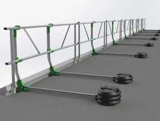 Temporäres Schutzgeländer aus stabilen Aluminiumprofilen mit einem max. Stützenabstand von 2,8m, mit Bortbrett auch auf Dachflächen ohne Attika einsetzbar, bis max. 10° Dachneigung