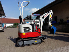 1,2 Tonnen Minibagger. Unterwagen verstellbar von 75 bis 120 cm. Standardtieflöffel 30 cm, Grabenräumlöffel 70 cm, Abbruchhammer 60 kg.