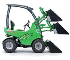 Multifunktionslader, Allradantrieb. Anbaugeräte: Schaufel ohne Zähne, Palettengabel, Sichelmäher mit Grasfangkorb.